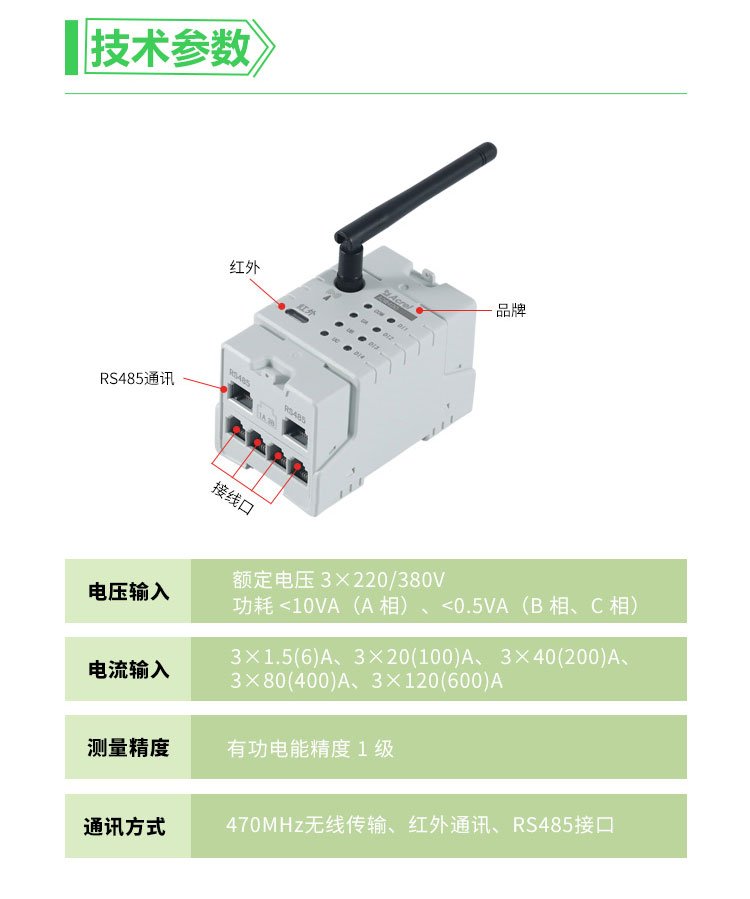 RS485 通讯和 470MHz 无线通讯功能,方便用户进行用电监测、集抄和管理。可灵活安装于配电箱内,实现对不