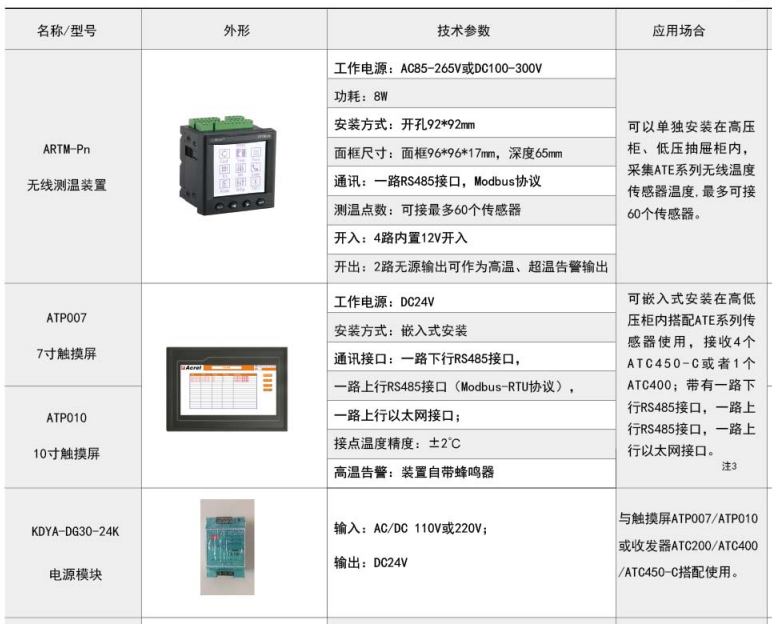 ARTM-Pn无线测温装置:ARTM-Pn无线测温装置可以单独安装在高压柜、低压抽屉柜内,每台装置可以接收18个传感器的数据,传感器型号可选配ATE100、ATE200、ATE300。装置带有一路485接口,可将采集到的温度数据上传到监控中心。