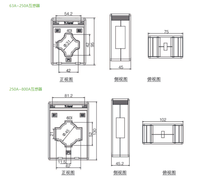 250(63A-250A) | 采用外置电流互感器 + 测量模块 | ||
