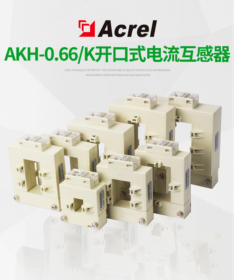 AKH-0.66K 系列开口式电流互感器主要应用于工业中城网、农网改造项目,安装方便,无须拆一次母线,亦可带电操作,不影响客户正常用电,为用户改造项目节省人力、物力、财力,提高效率。该系列电流互感器可与继电器保护、测量以及计量装置配套使用。