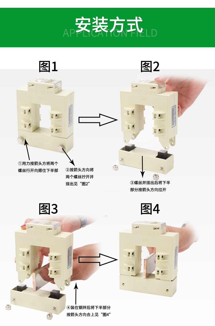 AKH-0.66K 系列开口式电流互感器主要应用于工业中城网、农网改造项目,安装方便,无须拆一次母线,亦可带电操作,不影响客户正常用电,为用户改造项目节省人力、物力、财力,提高效率。该系列电流互感器可与继电器保护、测量以及计量装置配套使用。