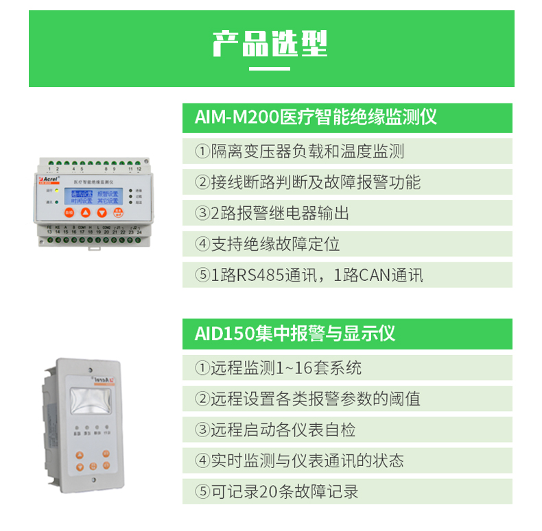 医用IT 系统绝缘监测产品(五件套)包括AITR 系列医用隔离变压器、AIM-M100 医疗智能绝缘监测仪、AKH-0.66P26 电流互感器、ACLP10-24 仪用直流稳压电源和AID 系列(AID100、AID120、AID130、AID150)外接报警与显示仪等.