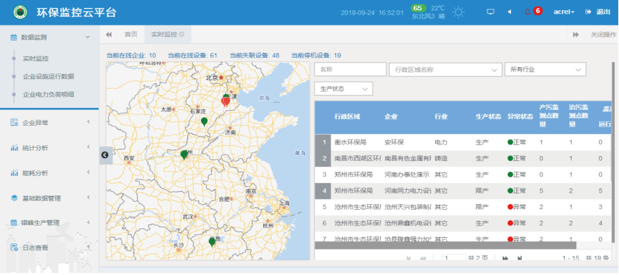 点位运行情况分析:按行业或区域统计分析企业、监测点、产污设施、治污设施等数量及运行状态。