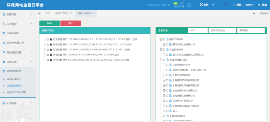 减排企业录入:按企业/行业/区域批量配置企业需要执行的减排方案。