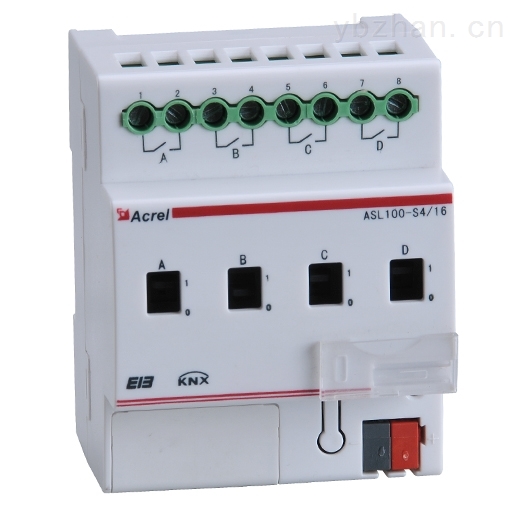 ASL100-Sx/16 系列开关驱动器作为执行单元,其作用是对各强电回路进行开关控制该驱动器每路继电器 大负载电流为 16A,负载可以为容性、阻性或者感性。此模块可以和符合 KNX 标准的任意控制模块进行连接。 开关驱动器接收并且解析报文,然后执行相应的动作。ASL100-SxI/16 系列开关驱动器除以上功能外,同时具 备电流检测功能,可通过阈值设置判断回路是否故障。 ASL100-Sx/16 系列驱动器有多种功能可选,具体使用需要通过 ETS 软件进行设置。