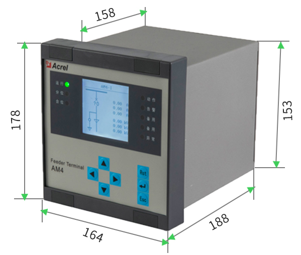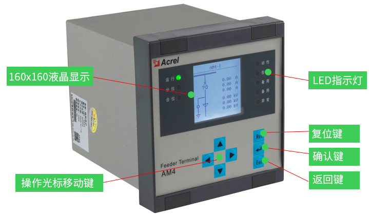 微机测控装置,AM4-I型号,三段式过流保护、两段式零序过电流保护、反时限过流保护、零序反时限保护、FC回路配合的过流闭锁功能、控故障告警.