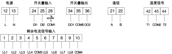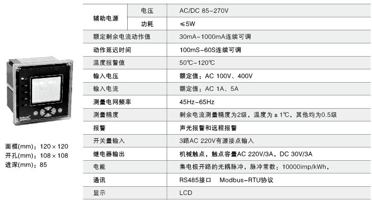 ● 实时监测一路剩余电流,一路温度。可选配三相电流,三相电压,频率,功率,四象限电能等电参量监测(具体见仪表选型);