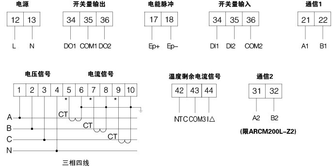 ARCM200L-Z: 三相电压、电流、功率、频率、四象限电能监测,过压、缺相、过流保护