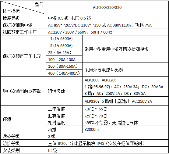 ALP200、ALP220、ALP320 系列智能型低压线路保护器(以下简称 ALP),适用于额定电压至AC 660V、额定电流至 AC 400A、额定频率为 50/60Hz 的低压系统。产品体积小,结构紧凑,安装方便,是低压馈线终端的保护、监测和控制的智能化综合装置。