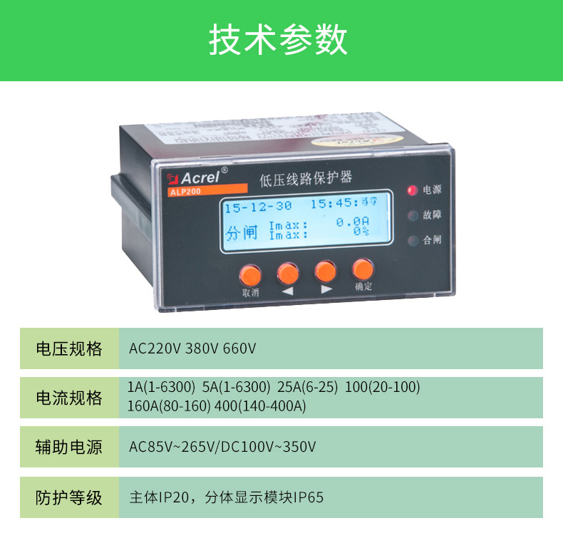 ALP系列低压保护器集保护、测量、控制、总线通讯为一体,同时提供了远程自动控制、现场直接控制、面板指示、信号报警、操作记录、跳闸报警记录及开关量记录等功能。