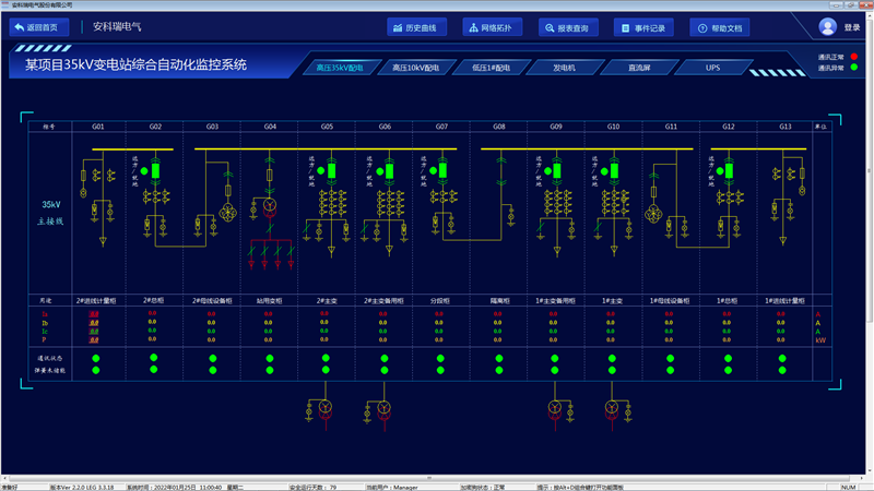 Acrel-1000变电站综合自动化系统,以配电一次图的形式直观显示配电线路的运行状态,实时监测各回路电压、电流、功率、功率因数等电参数信息,动态监视各配电回路断路器、隔离开关、地刀等合、分闸状态及有关故障、告警等信号。