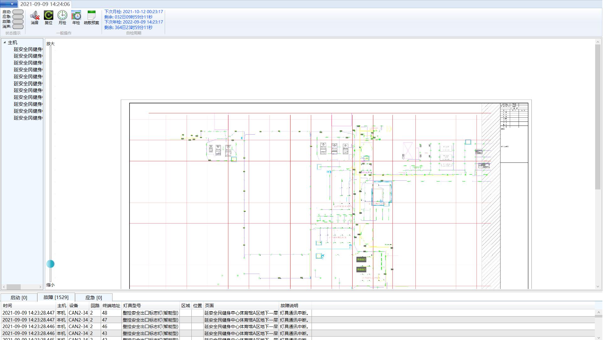 主要由应急启动、应急停止与手动火警组成,应急启动与停止用来测试设备应急功能是否正常,手动火警测试再具体着火点下系统的启动情况。