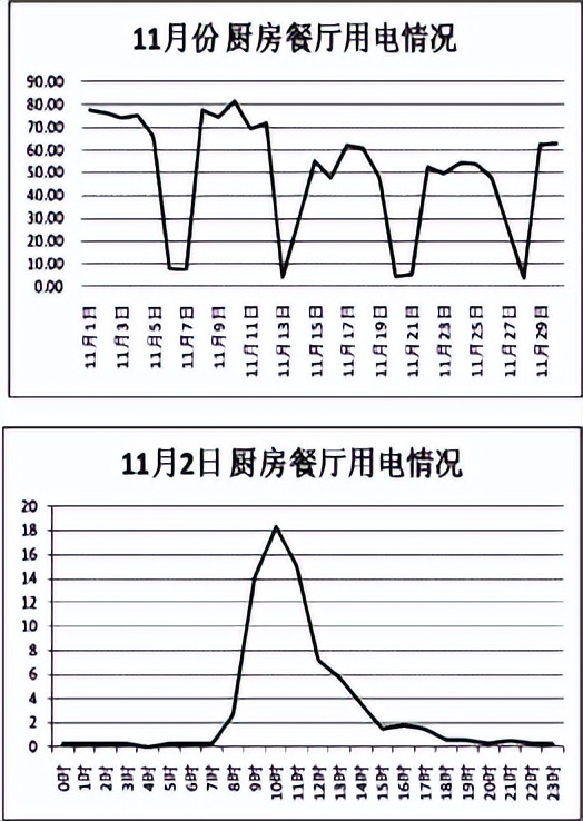 该楼宇厨房餐厅主要为办公人员准备午餐,其工作时间是周一至周五的早8时到14时左右。从图4可知,厨房餐厅的用电基本符合其工作规律,4个波谷对应的正是当月的4个双休日;这一用电支路还包括1楼大厅的用电,故14时之后还有物业的接待与值班人员活动的用电能耗。