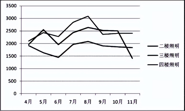 从图2可知,各层空调用电基本规律相同,7、8月份是空调用电的高峰期。3楼与2楼的空调用电基本相同,但考虑到2楼的计量面积较少,故2楼的单位面积空调用电较高。4楼空调用电夏季使用较多,符合其人数较多的现状,而进入11月份其空调用电较2、3楼低,可能与其工作人员中占多数的年轻人对低温适应能力较强而未开启空调有关,见图2。