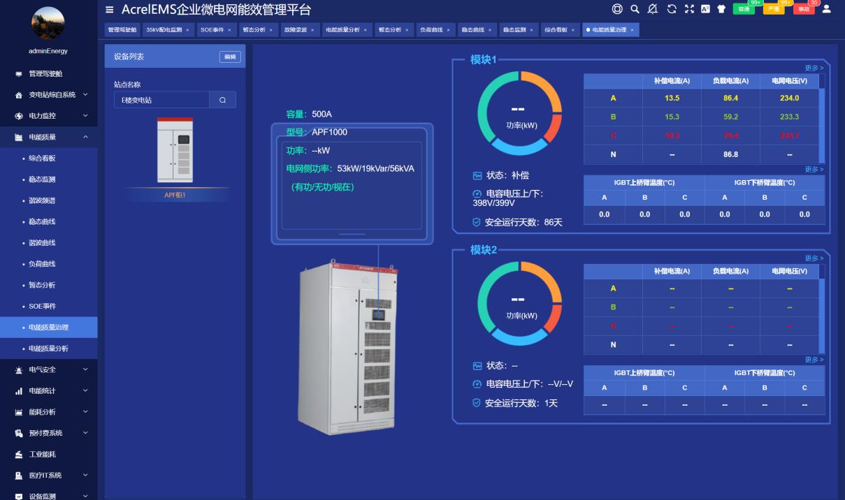 配置有源滤波装置和无功补偿装置对0.4kV侧电能质量进行补偿和治理,并监测有源滤波装置和无功补偿装置运行情况,确保电能质量符合生产要求。