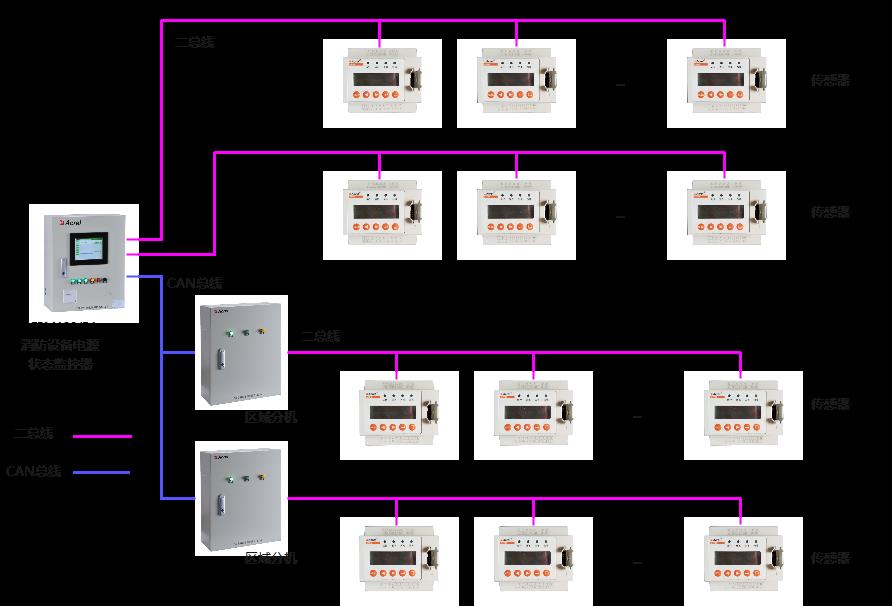 消防设备电源监控系统作为消防联动控制系统的必要子系统,一般设置在消防控制心,由电源状态监控主机、监控传感器(包括电压传感器、电流传感器、电压/电流传感器等全部或部分组成)及系统总线组成。