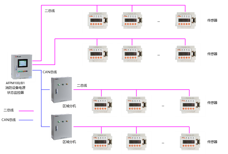 AFPM消防设备电源监控系统由消防设备电源状态监控器(区域分机)、传感器、中继器、系统主机和配套附件组成。
