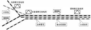 合肥至蚌埠客运专线(以下简称合蚌客专)由京沪高铁蚌埠南站引出,终于合肥枢纽合肥站,与水蚌线、淮南线、商合杭高铁、合福铁路等多条铁路或交叉或并行,牵引供电系统采用AT供电方式,新建刘府、水家湖、邵岗3座牵引变电所。为了实现资源共享,节省工程投资,根据线位特点,3座牵引变电所同时为多条铁路供电:刘府牵引变电所为合蚌客专、水蚌线供电;水家湖牵引变电所为合蚌客专、水蚌线、淮南线、商合杭高铁供电;邵岗牵引变电所为合蚌客专、淮南线、商合杭高铁、合福铁路供电。合蚌客专线路及牵引变电所分布示意图如图1所示。