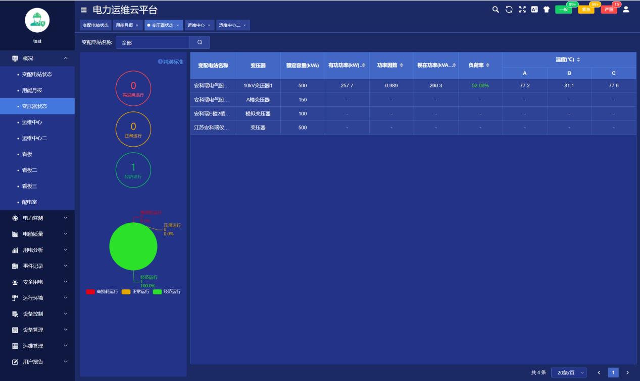 变压器状态支持用户查询所有或某个站所的变压器功率、负荷率、等运行状态数据,支持按负荷率、功率等升、降序排名。