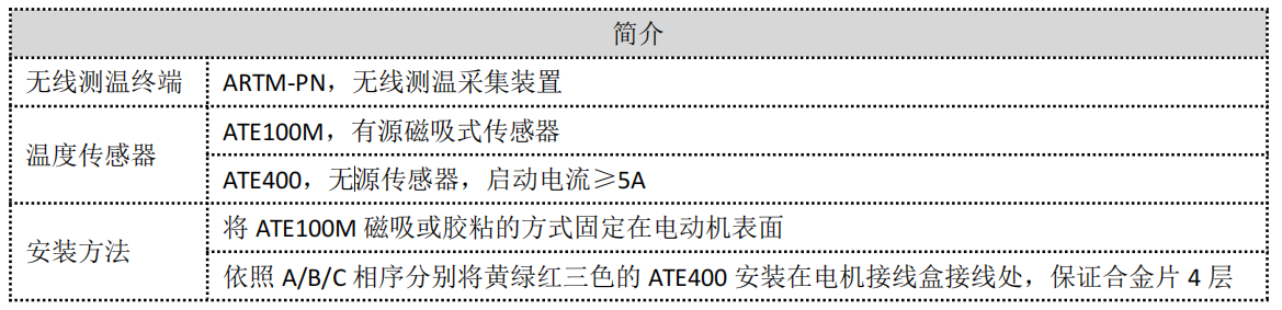 电机因接头制造技术不好,压接不紧密等因素,造成接头处接触电阻过大,引起电机接 线处温度过高,从而导致火灾等严重事故。 出于安全角度,推荐使用无线测温方案。推荐使用 ATE400 安装在电机接线盒接线处或 ATE100M 吸附在电动机表面,将采集到的温度数据,通过无线信号传输到 ARTM-Pn 显示端。