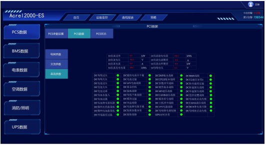 PCS监控:满足储能变流器的参数与限值设置;运行模式设置;实现储能变流器交直流侧电压、电流、功率及充放电量参数的采集与展示;实现PCS通讯状态、启停状态、开关状态、异常告警等状态监测。