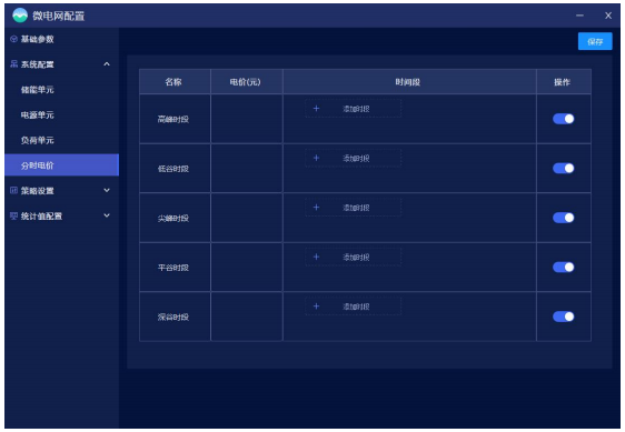 满足储能系统设备参数的配置、电价参数与时段的设置、控制策略的选择。目前支持的控制策略包含计划曲线、削峰填谷、需量控制等。