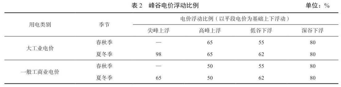 为了提高电力资源的利用效率,多年前我国许多地区就开始实行峰谷分时电价政策:不同用电时段的电价不同。这一政策的出发点是充分发挥市场作用,促进社会资源的合理配置,实际应用中就是鼓励用户合理安排生产时段、调整用电负荷,削峰填谷。当前浙江省的电价政策是根据用电负荷将春秋季的每天划分为高峰、平段和低谷三个时段,将夏冬季的每天划分为尖峰、高峰、平段和低谷(含深谷)四个时段,见表1,各时段执行不同的电价见表2。由表1和表2可见,既使执行一般工商用电电价标准,服务区的用电高峰与政策规定的高峰时段基本一致,因此服务区的电价至少是平段电价的1.5倍。
