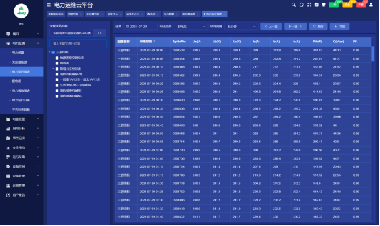电力运行报表显示选定站所选定设备各回路采集间隔运行参数和电能抄表的实时值及平均值行统计。
