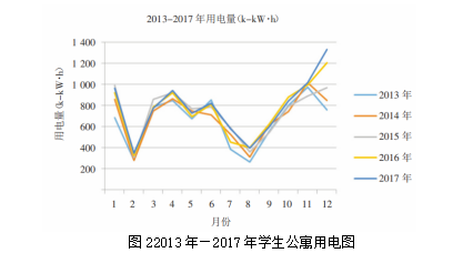 学生公寓的主要耗电设备为照明、网络通讯,相对比较单一和集中。只要学校管理部门明确规章制度,加强对学生公寓的日常用电管理,本文以北方某高校学生公寓2013年—2017年用电能耗为例,分析了学生公寓的用电情况,其结果表明学生公寓全年用电处于相对稳定状态(如图2所示)。