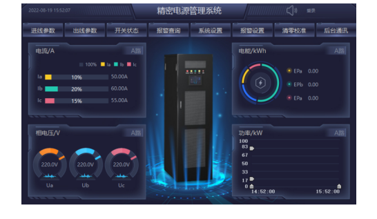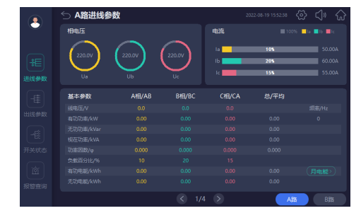开机进入主页,包含进线参数、开关状态、出线参数、报警查询等功能,按按钮可进入各功能界面查看。