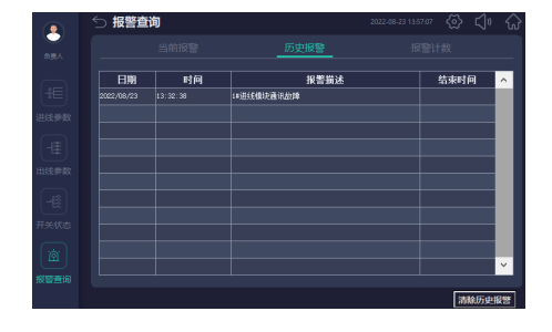 当前报警界面可查看实时报警和历史报警;开关量动作告警;任意数据的定时存储;进线过电流2段阀值越限告警,可任意设定告警值;进线过压、欠压、缺相、过频率、低频率越限告警; 声光告警功能。