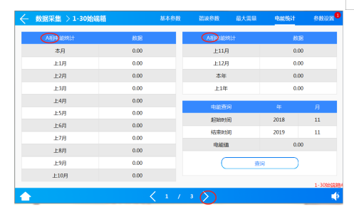 电能情况可以查询上12月份的每个月用电量、上一年总用电量、本年已用电量、根据选择不同时间查询电能值。