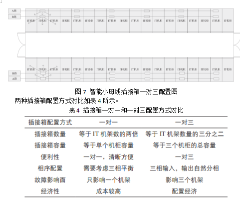 虽然插接箱一对一的配置方式清晰方便,发生故障时只影响一个机架,但成本较高。考虑到IT机柜有两路供电,由于采用单列单母线方式,需要跨列桥架,布线难度两路供电同时发生故障的可能性很低,而且,一对三方式采用一般三相输入,输出到三个机柜自然分相,不需要额外考虑三相平衡问题,因此推荐采用一对三的配置方式。