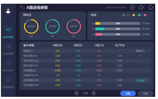 开机进入主页,包含进线参数、开关状态、出线参数、报警查询等功能,按按钮可进入各功能界面查看。