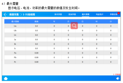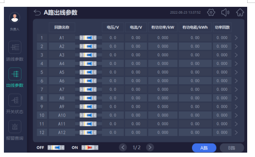 分支回路的电压、电流、有功功率、有功电能、功率因数额定电流设置、各相电流值;负载百分比;最大需量。