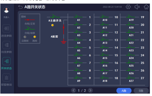 左侧一列为主路开关状态,主路跳闸SD状态、主路防雷开关状态、主路防雷故障点状态,默认为无源检测点,分闸为绿色,合闸为红色。主路右侧的皆为支路开关状态;默认为有源检测点,合闸为红色,分闸为绿色。