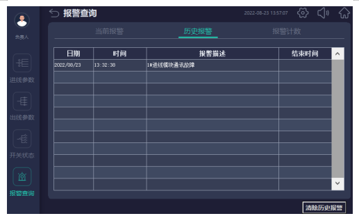 当前报警界面可查看实时报警和历史报警;开关量动作告警;任意数据的定时存储;进线过电流2段阀值越限告警,可任意设定告警值;进线过压、欠压、缺相、过频率、低频率越限告警;声光告警功能。