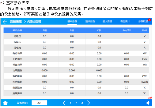 显示电压、电流、功率、电能等电参数数据,在设备地址旁边的输入框输入本箱子对应的仪表地址,即可实现对箱子中仪表数据的采集。
