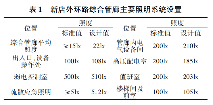 综合管廊是位于地下的城市管道,缺少自然光源,照明系统依靠人工敷设。综合管廊的照明系统总的可为一般照明与应急照明两部分.根据用途与场合可再细分为综合管廊一般照明、综合管廊应急照明、综合管廊疏散照明、设备房一般照明与设备房应急照明等5类。为兼顾能源的节约与运维人员在日常检修中的安全和工作,需要以及应对紧急突发情况时的疏散需求,新店外环路综合管廊项目照明系统的照度设计略高于GB50838-2015中要求的低值,其主要照明系统设置如表1所示