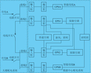 数据中心智能母线供配电系统采用树干式的供配电系统,UPS总输出配电柜至各IT设备机柜之间采用两条干线(智能母线)连接的配电方式。其优点是消耗的有色金属导体量相对较少、安装施工快捷方便、即插即用、系统扩展灵活,可满足不同承租用户的个性化业务用电容量,易于扩展与变更。与电力电缆相比,智能母线可靠性更高、工程生命周期长,并且可重复利用。其缺点是智能母线主干线发生故障时,影响范围大,但母线干线的故障概率很低。