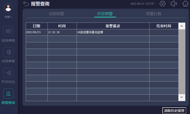 当前报警界面可查看实时报警和历史报警;开关量动作告警;任意数据的定时存储;进线过电流2段阀值越限告警,可任意设定告警值;进线过压、欠压、缺相、过频率、低频率越限告警;声光告警功能。