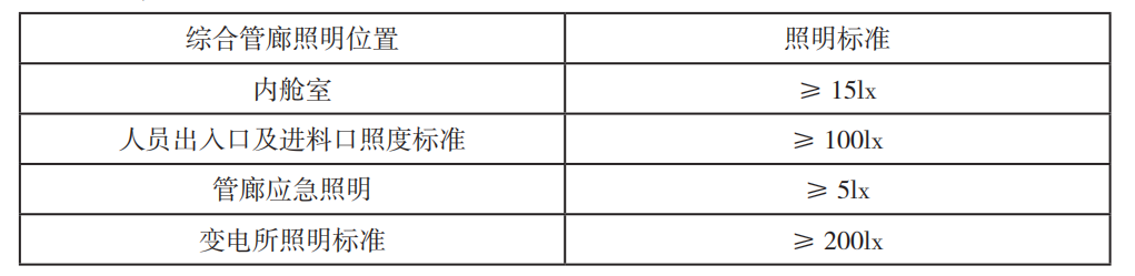 照明系统是综合管廊电气系统的重要组成部分,因此应按照一定的标准,进行照明系统的设计,具体应按照以下标准进行设计,如下表所示: