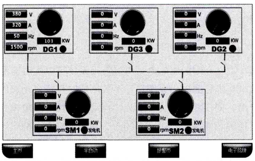 电能管理系统在触摸屏上用图形和表格方式形象直观地显示各发电机组的工作状态及萤要参数值的报警信息,如图2所示。触摸屏主要有以下功能: