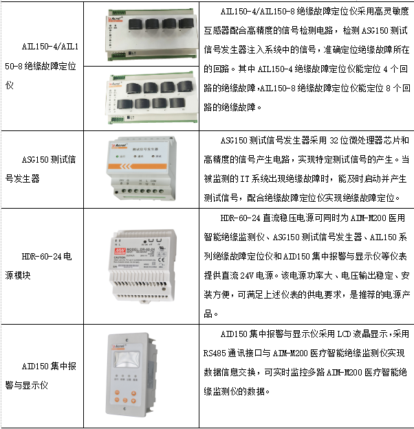 医用IT系统绝缘监测及故障定位产品(七件套)包括AITR系列医用隔离变压器、AIM-M200医疗智能绝缘监测仪、AKH-0.66P26电流互感器、AIL150-4/AIL150-8绝缘故障定位仪、ASG150测试信号发生器、HDR-60-24电源模块和AID150集中报警与显示仪等,产品如表1所示。