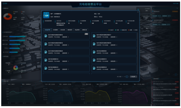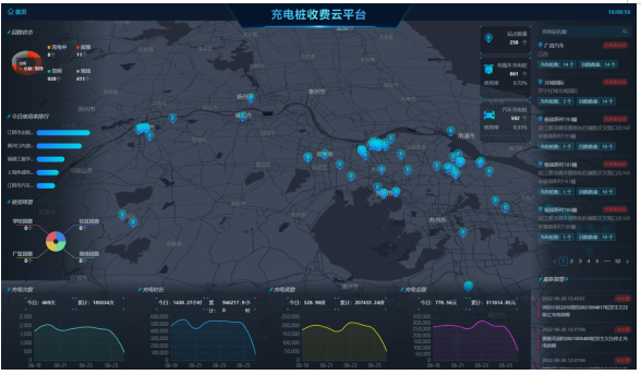 智能化大屏展示站点分布情况,对设备状态、设备使用率、充电次数、充电时长、充电金额、充电度数、充电桩故障等进行统计显示,同时可查看每个站点的站点信息、充电桩列表、充电记录、收益、能耗、故障记录等。