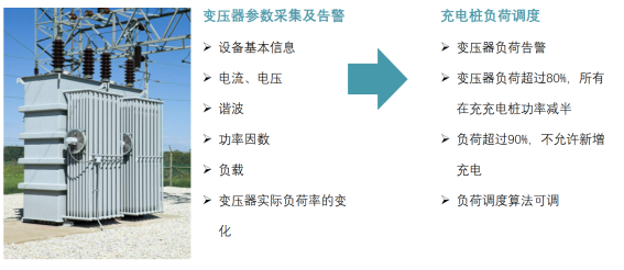 实时监视变压器的运行状态及用能参数,当变压器负荷超出设计容量时,进行充电桩负荷调度。