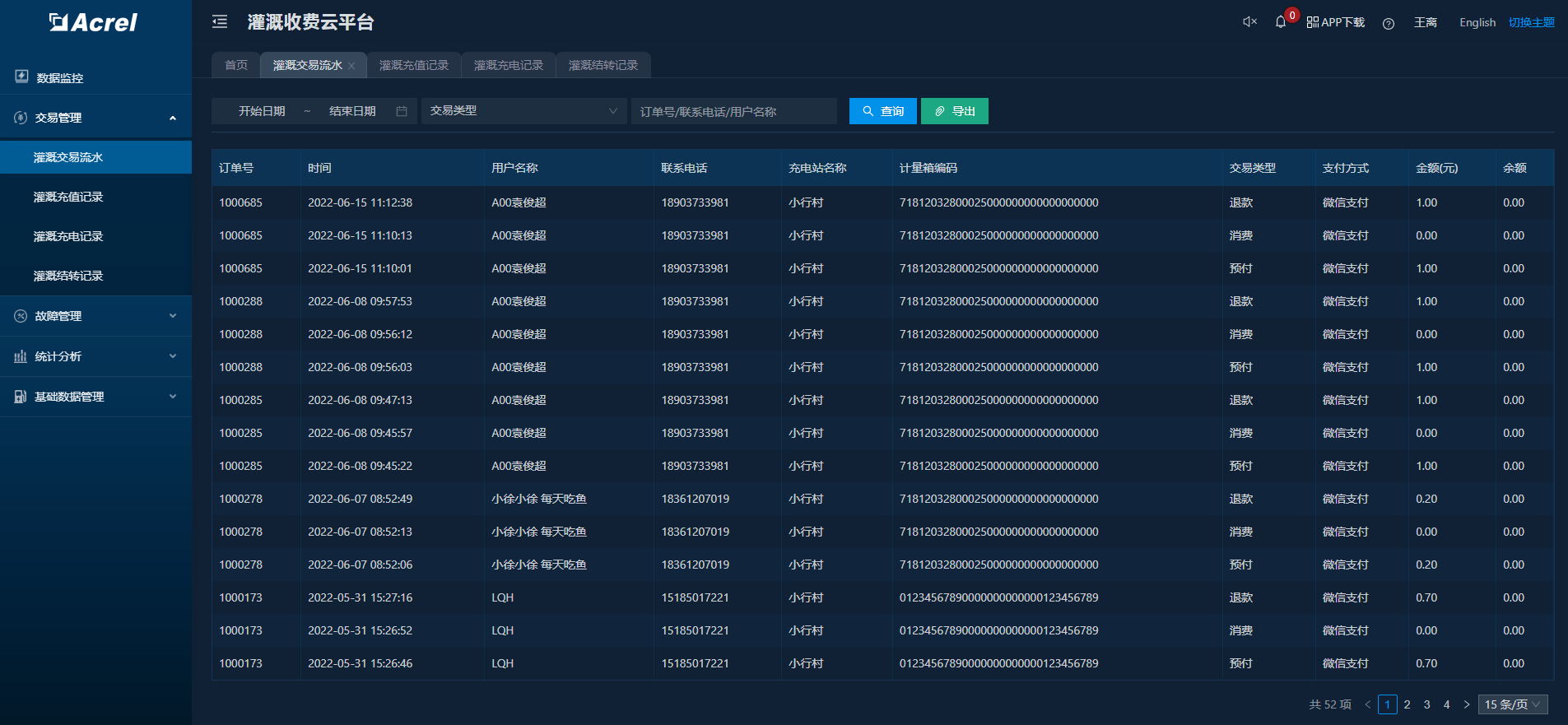 汇总订单记录,支持订单详情查询,订单包括预付、消费、退款等类型,支付方式支持微信、支付宝、电子钱包等。
