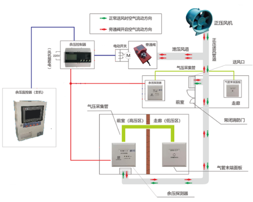 消防正压送风系统作为建筑消防的一个重要组成部分,可以防止烟雾进入逃生通道,但是机械加压送风系统本身没有能力判断或控制加压区压力的大小,压力过小,不能保证防烟的效果,压力过大又会造成防火门打不开特别是对老幼等弱势群体的严重后果,因此引入余压监控系统其重要性与必要性是不言而喻的,发生火情时,该系统可以实时监控并控制防火门两侧余压值的变化,在保障人员快速逃离火灾现场的前提下,又保证烟雾不会倒灌进逃生通道,对消防应急逃生起到更完善的逃生方案和预防。