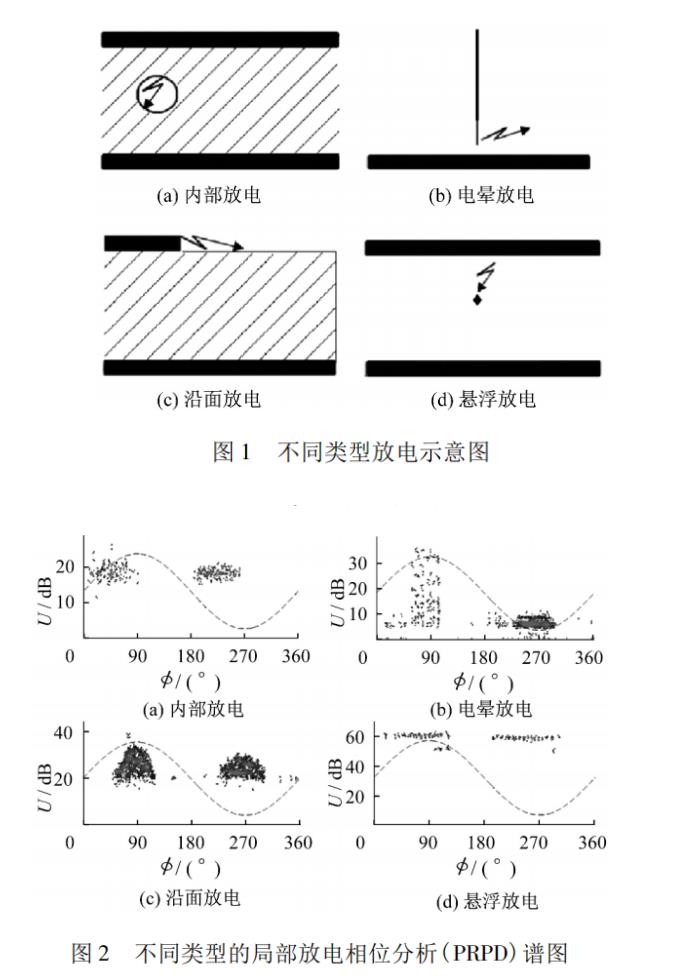 绝缘故障潜伏期会产生放电现象,开关柜内的局部放电主要有以下4种:由于制作工艺引入绝缘介质内部的气隙、杂质等造成绝缘介质内部缺陷引发的内部放电;由于暴露在空气中的金属表面毛刺引起的电晕放电;绝缘介质表面污染物引起的沿面放电;由于结构设计缺陷、运输以及运行过程中结构缺陷造成的接触不良引起的悬浮电位放电。不同类型放电示意图如图1所示。不同类型的局部放电相位分析(PRPD)谱图如图2所示。不同放电类型的PRPD谱图特性明显不同,依据放电相位和幅值的区别可作为模式识别的重要依据。