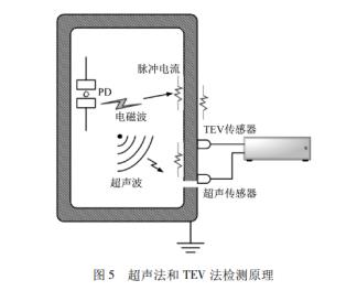 地电波(TransientEarthVoltage,TEV)理论由Dr.JohnReeves在1974年提出。TEV检测法作为一种经典的开关柜局部放电检测方法,得到了发展和关注。根据麦克斯韦理论,电磁波在空间传播时遇到导体,会使导体产生感应电流,且感应电流与激起其电磁波的频率相同。由局部放电脉冲产生的电磁波通常是几千赫兹到几十兆赫兹,因此开关柜柜体内部电磁波传输到开关柜柜体内表面并在靠近放电点的金属表面会感应出短的脉冲电流。受到“集肤效应"的影响,此脉冲电流首先在金属屏蔽内表面传播,如果金属外壳对内是连续屏蔽的,则无法在外部检测到局部放电信号,但是实际上开关柜的金属外壳在绝缘衬垫、箱体连接处、终端等部位会存在不连续的缝隙,高频脉冲电流信号可通过这些缝隙传输到开关柜柜体外层,产生一个暂态电压,此电压信号称为暂态对地电压(TEV),在开关柜外表面通过专用的耦合电容传感器即可测得此信号,并且通过此信号判断开关柜内是否存在局部放电以及放电的强弱。超声法和TEV法检测原理如图5所示。